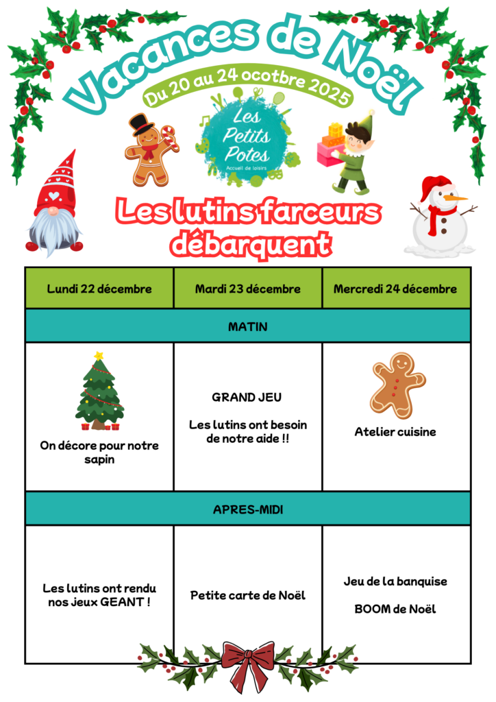 Vacance de la Toussaint 2025 Vacance de la Toussaint 2025 22 septembre 2025 Les Petits Potes Programmes détaillés à venir rapidement !! Programme-automne-2025-VERSION-2Télécharger